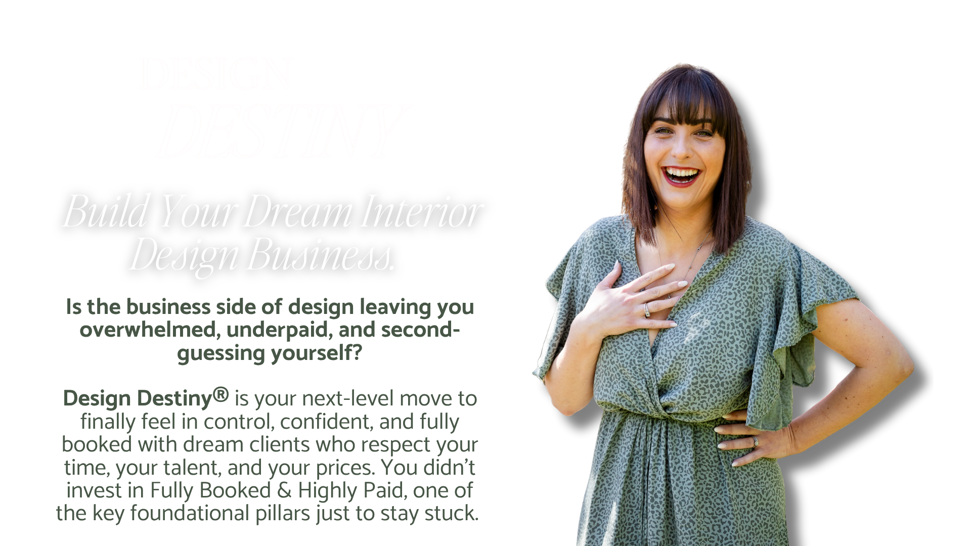 Design Destiny® is your next-level move to finally feel in control, confident, and fully booked with dream clients who respect your time, your talent, and your prices. You didn’t invest in Fully Booked & Highly Paid, one of the key foundational pillars just to stay stuck.
