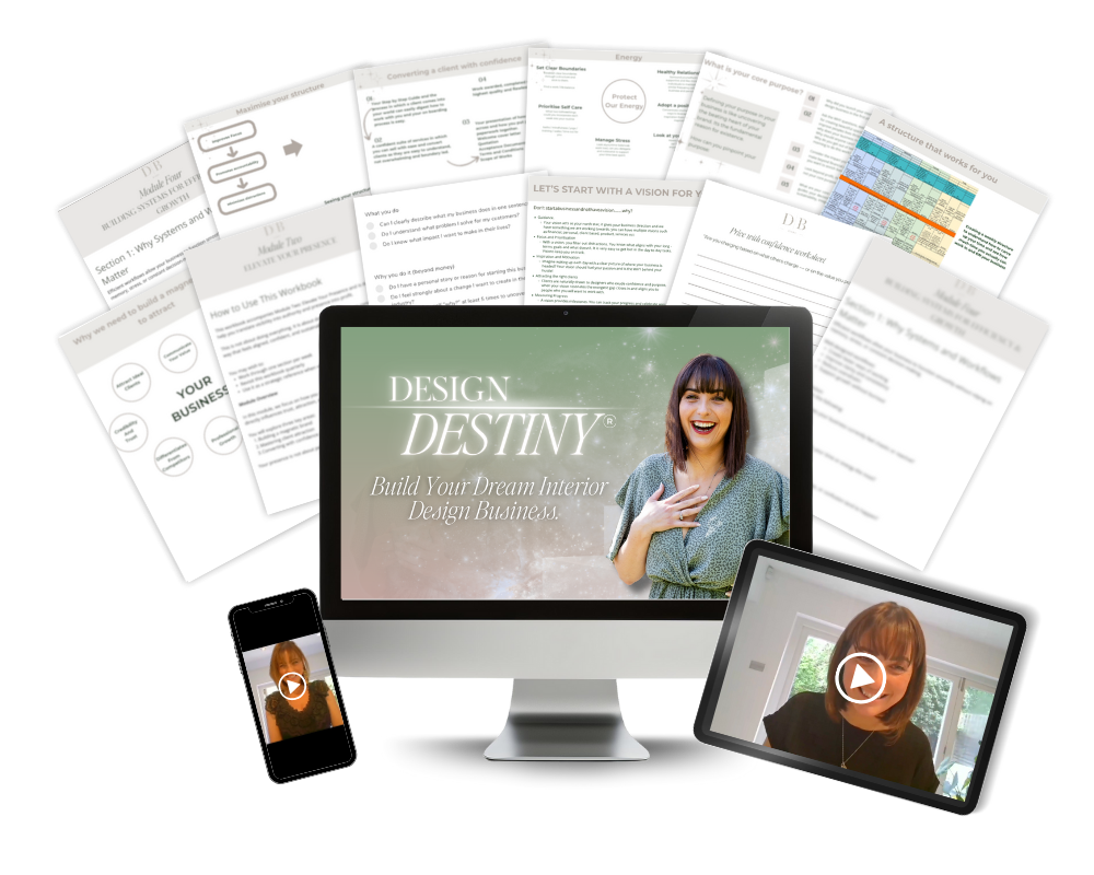 Design Destiny is a six-module, self-paced foundations programme for interior designers who want clarity, confidence, structure, and direction in their business.